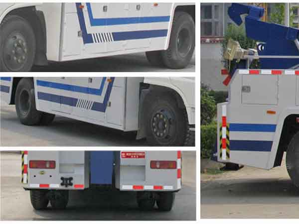 托舉質量4500kg;整備質量為7800kg,對應整車長(mm):7900,對應軸距(mm):5000;選裝托吊分離型上裝,托舉質量4200kg;整備質量為8100kg,對應整車長(mm):7600,對應軸距(mm):4700。防護材料:Q235A碳鋼,連接方式:左右側面防護裝置為整體結構,與副梁焊接連接;后部專用裝置與后防護干涉,故后防護豁免。 | ||