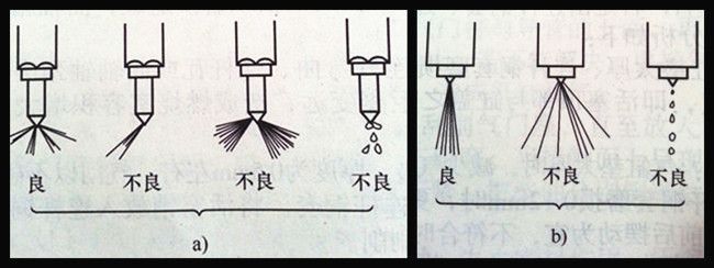 應緩慢而連續地按下檢查儀的手柄以檢查噴油器的噴油質量。對于多孔噴油器,各個噴孔噴出的油應形成一個霧化良好的油束,油束之間的間隔角度應符合噴射要求,如下圖a所示。對軸針式噴油器,要求噴霧為圓錐形,不得偏斜,且噴霧應細小而均勻,如下圖b所示。