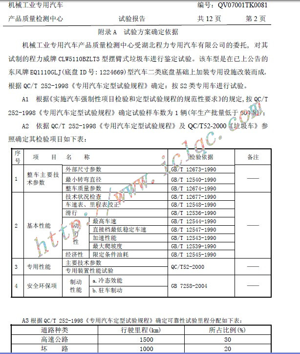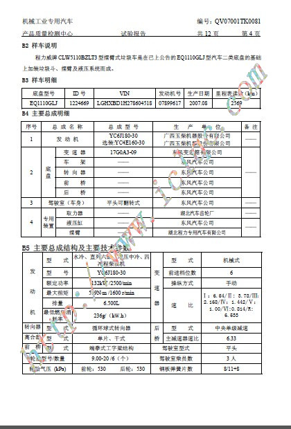 程力環(huán)衛(wèi)垃圾車CLW510BZLT3B擺臂垃圾車的檢測報告: