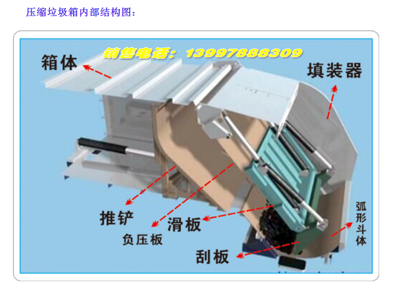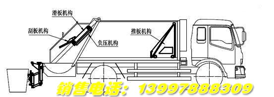裝垃圾:壓縮垃圾車通過液壓翻轉機構將垃圾裝人填裝器內,操作刮板,滑板沿弧型斗體將垃圾刮起,使用負壓將垃圾推進垃圾箱內。