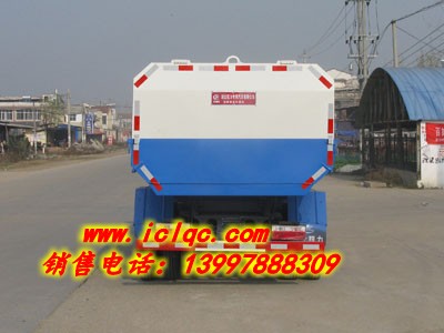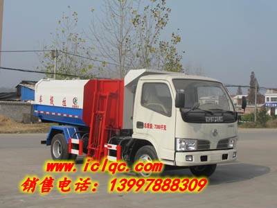 東風4方掛桶式垃圾車箱體裝置:為密封式結構,在箱體前部設有進料箱蓋,側面設有自裝料裝置,箱體后部設有卸料門。