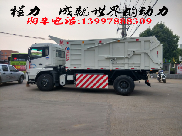 該車主要用于城鄉垃圾壓縮站的垃圾清運。垃圾壓縮站對垃圾進行收集、壓縮后將箱體垂直舉起,并打開壓縮箱排泄門,這時垃圾車箱體后門向上旋轉開啟,垃圾車后門與壓縮箱后門對接,之后垃圾塊被壓縮箱內的推板水平推進到垃圾車箱體內,完成垃圾裝載后關閉垃圾車后門,將垃圾運到垃圾處理地進行傾卸。該車由液壓控制系統來完成該車的后門的開啟和關閉及自卸功能,降低了工人的勞動強度和改善了工作環境。該垃圾車的收運方式是目前國內廣泛采用的垃圾壓縮站垃圾轉運方式,可以實現一車多站,大大降低了配備成本和空間等等;其專用裝置的功能均以汽車發動機為動力,通過液壓機構手動或電控、氣控來實現。車輛的箱體采用優質炭鋼板全密封焊接結構,具有強度高、重量輕,不產生二次污染等優點。