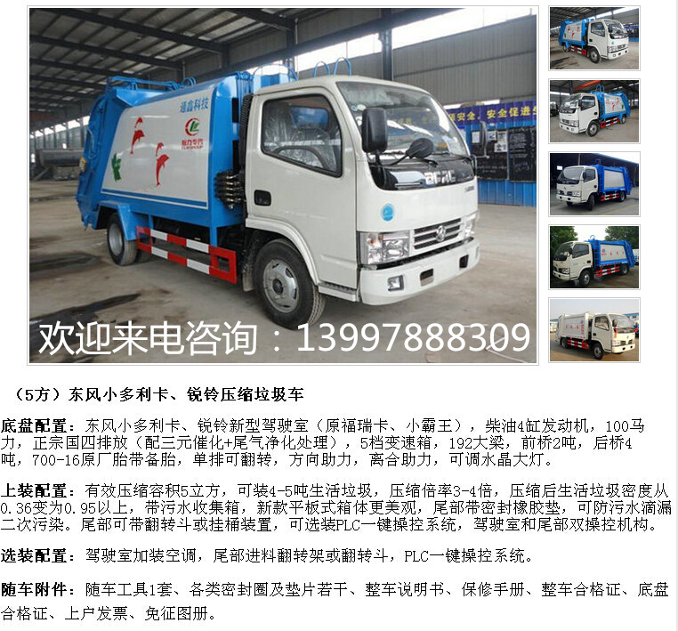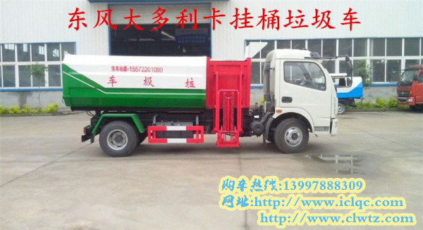 四、東風大多利卡掛桶垃圾車,整車型號為CLW5080ZZZT5,底盤型號EQ1082GLJ2,總質量8250kg,整備質量4330kg,額定質量3725kg,3300mm軸距,朝柴151馬力國五發動機,7.50-16LT輪胎。該款掛桶垃圾車屬于自裝卸式垃圾車,側面帶掛桶提升機構,垃圾桶可選擇120L或240L的鐵桶或塑料桶。