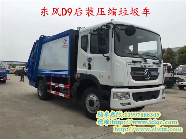 三、東風D9后裝壓縮垃圾車,整車型號為CLW5181ZYSE5,底盤型號EQ1181LJ9BDE,總質量18噸,額定質量8.1噸,整備質量9.7噸,4500mm軸距,康明斯210馬力國五發動,10.00R20鋼絲胎。該款壓縮垃圾車的容積為10噸,后垃圾裝載樣式可以選裝三角斗裝置、掛桶裝置、擺臂裝置、大落地斗裝置、無后翻轉裝置。