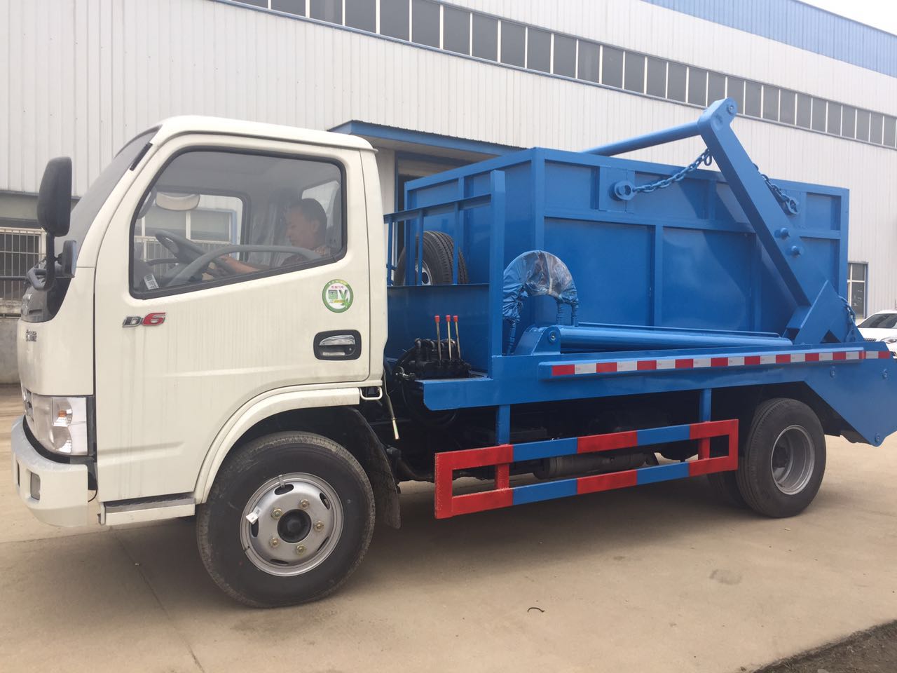 四、東風天錦擺臂式垃圾車的料斗分密封、敞開兩種。先將垃圾裝進料斗,后上吊鏈,然后操控擺臂吊料斗上車。