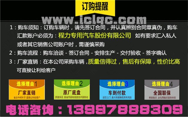 程力專用汽車改裝廠歡迎各位新、老朋友惠顧,并期待著您的光臨。同時,我公司可憑貴單位的責(zé)任傳真,或預(yù)付部分車款后,優(yōu)惠辦理送車業(yè)務(wù);到我公司提車,我公司為您代辦全套行車手續(xù)。